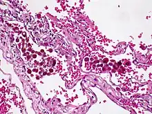 L'hémosidérose localisée est un dépôt d'hémosidérine (complexe protéique riche en fer) limitée à un tissu ou un organe. Elle s'oppose à l'hémosidérose systémique (ou hémosidérose généralisée). De façon générale, la surcharge en fer des tissus qui composent l'organisme, est appelée hémosidérose. C'est un phénomène extrêmement banal, en effet toute hématie ayant traversé la paroi d'un vaisseau par rupture de celui-ci (hémorragie) ou par érythrodiapédèse est détruite sur place par les macrophages qui vont élaborer du pigment ferrique à partir de l'hémoglobine[1]. Chaque hémorragie intratissulaire est donc vouée à laisser place à une plaque d'hémosidérose ; l'hémosidérose localisée se rencontre donc essentiellement dans les zones d'hémorragies anciennes[2].