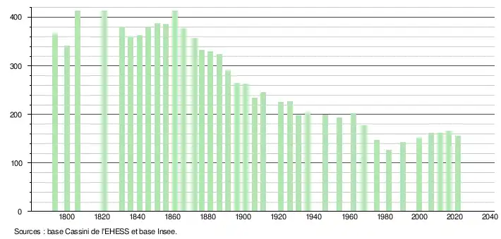 L'évolution du nombre d'habitants est connue à travers les recensements de la population effectués dans la commune depuis 1793. Pour les communes de moins de 10 000 habitants, une enquête de recensement portant sur toute la population est réalisée tous les cinq ans, les populations légales des années intermédiaires étant quant à elles estimées par interpolation ou extrapolation[30]. Pour la commune, le premier recensement exhaustif entrant dans le cadre du nouveau dispositif a été réalisé en 2006[31].