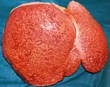 Photographie d'un foie cirrhotique, causé par l'alcoolisme. L'éthanol est une hépatotoxine.