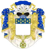 Sur le blason : Les ducs ajoutent un chef de gueules, semé d'étoiles d'argent. Ornements extérieurs : Six lambrequins d'or. Toque de velours noir, retroussée d'hermine, avec porte-aigrette d'or, surmonté de sept plumes d'argent. Manteau d'azur, doublé de vair. |