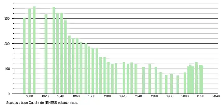 L'évolution du nombre d'habitants est connue à travers les recensements de la population effectués dans la commune depuis 1793. Pour les communes de moins de 10 000 habitants, une enquête de recensement portant sur toute la population est réalisée tous les cinq ans, les populations légales des années intermédiaires étant quant à elles estimées par interpolation ou extrapolation[32]. Pour la commune, le premier recensement exhaustif entrant dans le cadre du nouveau dispositif a été réalisé en 2004[33].