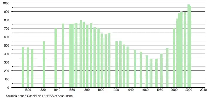 L'évolution du nombre d'habitants est connue à travers les recensements de la population effectués dans la commune depuis 1793. Pour les communes de moins de 10 000 habitants, une enquête de recensement portant sur toute la population est réalisée tous les cinq ans, les populations légales des années intermédiaires étant quant à elles estimées par interpolation ou extrapolation[13]. Pour la commune, le premier recensement exhaustif entrant dans le cadre du nouveau dispositif a été réalisé en 2004[14].