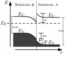 Cette différence de gaps se répartit alors en deux discontinuités : la discontinuité de bande de valence () et la discontinuité de bande de conduction () de sorte que :
