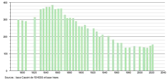L'évolution du nombre d'habitants est connue à travers les recensements de la population effectués dans la commune depuis 1793. Pour les communes de moins de 10 000 habitants, une enquête de recensement portant sur toute la population est réalisée tous les cinq ans, les populations légales des années intermédiaires étant quant à elles estimées par interpolation ou extrapolation[15]. Pour la commune, le premier recensement exhaustif entrant dans le cadre du nouveau dispositif a été réalisé en 2007[16].