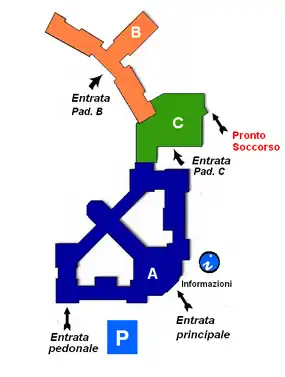 À la suite de la réorganisation de l'établissement, une série d'interventions de refonte structurelle du complexe hospitalier a été lancée, avec une révision complète de la distribution interne des pavillons A et B, tant du point de vue de la construction que des systèmes. Le nouveau bâtiment C a alors été activé pour abriter le Service des Urgences et de l'Acceptation (DEA) de niveau II.