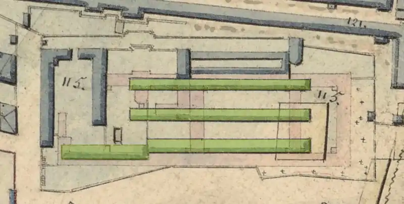 L'hôpital en 1855. Le Jardin botanique se trouve devant l'hôpital.