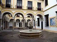 L’hôpital s’organise autour d'un patio rectangulaire. Ce patio est orné sur trois de ses côtés de galeries clôturées par des arcades en plein cintre soutenues par des colonnes de marbre. Il est divisé en son par une élégante galerie à portique de la même facture, qui définit deux espaces de surface identique[3]. Au centre de chacun de ces espaces se dressent deux belles fontaines italianisantes. Sur leurs vasques octogonales sont placées des statues, réalisées à Gênes et livrées en 1682. Elles représentent la Foi et la Charité. Les murs des galeries sont revêtus de sept beaux panneaux d'azulejos bleus et blancs. De style hollandais, ils furent probablement exécutés à Delft au XVIIe siècle, pour le couvent des Descalzos de Cadix. Ils furent déplacés à Séville en 1690[2]. Ces azulejos représentent des scènes de l’Ancien et du Nouveau Testament.