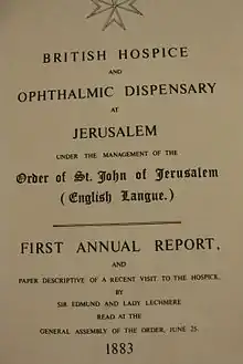 Le premier hôpital du Très vénérable ordre de Saint-Jean ouvre en 1882 sur la route de Bethléem, au sud de la vieille ville de Jérusalem. La reine Victoria le reconnaît officiellement et lui accorde une charte royale. Sir Edmund Lechmere, un des fondateurs du Très vénérable ordre de Saint-Jean est l'une des figure clefs de sa création[1].