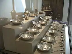 On trouve dans ce service en argent une grande unité de l'ensemble des pièces qui le composent. C'est ce qui fait en grande partie sa rareté, du fait que la plupart des trésors médiévaux ne possèdent pas d'unité et livrent des reliques éparses. Le trésor est retrouvé en 1953 lors de la restauration complète de la salle des malades. Les pièces sont retrouvées dans un sarcophage. Le trésor contient deux pièces phares : l'une est un gobelet en argent repoussé, et l'autre un récipient verseur à couvercle. Ce sont les deux pièces ayant conservé la meilleure décoration dorée et gravée. La majorité des coupes à boire portent des décors gothiques. La marque c comme Coëffort est disposée sur huit des pièces, la lettre encerclant une croix pâtée. On trouve à côté, le nom des plus éminents membres de la confrérie. Ceux-ci ont pu être identifiés grâce à des sources manuscrites et dateraient du début du XVe siècle. On sait de source sûre que le trésor fut enfoui en 1420 durant la guerre de Cent Ans, afin qu'il ne soit pas pillé par les Anglais réussissant leurs incursions dans le Maine. Faisant le siège du Mans en 1425, force est de constater que le trésor ne fut jamais trouvé.