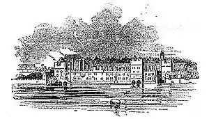 Lithographie en noir et blanc représentant un long bâtiment à plusieurs étages au bord de la Tamise.
