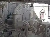 L’escalier d'honneur actuel est la troisième version. L'escalier primitif était en fer à cheval surmonté d'un baldaquin. L'ingénieur Claude Masse disait de cet escalier « C'est une espèce de fer à cheval mal construit et trop raide... »[MAS 3]. En 1612, on installe sous le baldaquin une statue du « bien bon ami des Rochelais »[44],[45], Henri IV. Cette statue, en terre cuite, peinte, représente Henri IV grandeur nature, en costume de guerre, revêtu d'une cuirasse, la tête nue, la main gauche sur la garde de son épée, et la droite appuyée sur un bâton de commandement[MAS 4],[MAS 3]. Outre la statue détruite lors de la Révolution, l'escalier s'écroula en 1812. En 1815, il est rebâti[46],[47] par Antoine Brossard, architecte de la commune. De style néoclassique, il s'harmonise mal avec le reste de la façade de style Renaissance et occupe un large espace de la cour[48]. Un nouvel escalier est conçu par J. Lisch plus en harmonie avec la façade de style Renaissance qui est réalisé au cours de la restauration du bâtiment à la fin du XIXe siècle[MFD 8]. Beaucoup plus petit et implanté devant le pavillon Nord, il permet un agrandissement de la façade principale avec l'ajout de deux nouvelles travées[PC 2]. L'escalier de l'architecte Juste Lisch comporte un baldaquin où est installée une statue du roi Henri IV en faïence polychrome de Théodore Deck[MFD 8].