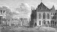Vieil hôtel de ville (à droite), annexe de 1683 (briques rouges) et nouvel hôtel de ville, vus du nord-ouest