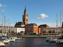 Le beffroi de l'hôtel de ville vu du port de plaisance