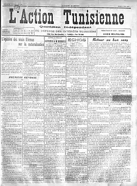 Le groupe reste en contact et décide de créer son propre journal grâce à l'aide du pharmacien Ali Bouhageb[34] : c'est ainsi que L'Action tunisienne voit le jour avec un comité de rédaction formé par Habib et M'hamed Bourguiba, Bahri Guiga, Tahar Sfar, Mahmoud El Materi, Ali Bouhageb et Béchir M'hedhbi. Le , son premier numéro est publié, Bourguiba consacrant son premier éditorial au budget[35]. Déçus par la modération résignée de leurs aînés, les jeunes nationalistes se déchaînent et prennent la défense du « petit peuple ». Bourguiba, qui devient de plus en plus connu grâce à ses écrits, sort fréquemment dans les cercles tunisois qu'il vient tout juste de connaître et s'enivre de ses succès de salon à Tunis et à Hammam Lif où il fréquente la famille Boulakbeche[36]. Il se montre clair et précis dans ses écrits, ce qui révèle un polémiste de talent grâce à ses solides arguments de juriste : il s'attache au fait de démontrer le mécanisme de l'exploitation coloniale en remontant des effets aux causes, tout en s'intéressant aux phénomènes sociaux, appelant les ouvriers et les étudiants à s'organiser pour mieux se défendre contre l'exploitation. De même, il incite à la défense et à la sauvegarde de la personnalité tunisienne[37].
