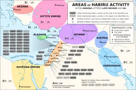 Pendant la période amarnienne, les Apirou menacent continuellement les villes égyptiennes du nord de Canaan[45]. Dans les Lettres d'Amarna, « Apirou » est un terme collectif qui désigne les brigands qui opèrent en Canaan, notamment dans les régions montagneuses où ils cherchent refuge. Ils semblent particulièrement actifs dans la vallée de la Bekaa. Les Apirou sont généralement hostiles aux intérêts de l'Égypte. Dans un cas, Damas s'allie cependant avec eux pour combattre des ennemis de l'Egypte. Dans les lettres, les apirou sont les archétypes des hors-la-loi. Leur mention est un argument pour dénoncer la violence des adversaires. La mention de l'alliance entre d'une ville avec les apirou est une manière de présenter les rois ennemis comme rebelles au pharaon[46]. Il est difficile de savoir si les Apirou constituaient réellement une force significative en Canaan ou si les plaintes au sujet de Apirou étaient un motif littéraire pour s'attirer l'aide de l'Égypte. Les Apirou semblent en effet être constitués en petites bandes itinérantes sans organisation centralisée et mal intégrés dans le système politique cananéen. Leur influence sur la politique régionale demeure limitée. Au-delà de la rhétorique présente dans les lettres, ces bandes peuvent avoir été utilisées dans les stratégies d'influence régionale[46]. Rib-Hadda de Byblos se plaint à la cour d'Egypte de l'expansion du royaume d'Amurru avec l'aide des Apirou[47]. Il est probable que leur présence ne soit pas gênante pour l'Égypte et qu'elle permette d'assurer la dépendance des royaumes vassaux à l'Egypte dont l'aide est nécessaire pour lutter contre les raids des Apirou[48]. Comme les apirou ne sont pas identifié à des cités, il semble qu'ils agissent en marge du système politique des centres urbains[49]. Mais bien qu'ils ne soient pas directement liés à des villes, ils ne se tiennent pas pour autant à l'écart du système urbain. Ils semblent aussi engagés dans la vie politique des cités cananéennes. Une lettre d'Amarna (EA 273) suggère que les apirou mènent des activités politiques. La lettre apporte l'exemple d'une correspondance diplomatique entre les apirou et les cités d'Ayyaluna et de Ṣarḫa[50]