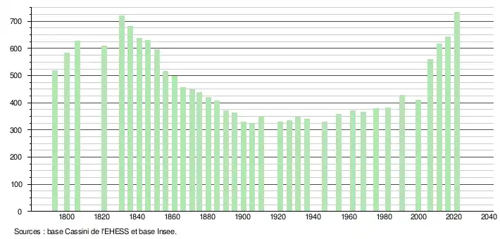 L'évolution du nombre d'habitants est connue à travers les recensements de la population effectués dans la commune depuis 1793. Pour les communes de moins de 10 000 habitants, une enquête de recensement portant sur toute la population est réalisée tous les cinq ans, les populations légales des années intermédiaires étant quant à elles estimées par interpolation ou extrapolation[17]. Pour la commune, le premier recensement exhaustif entrant dans le cadre du nouveau dispositif a été réalisé en 2006[18].