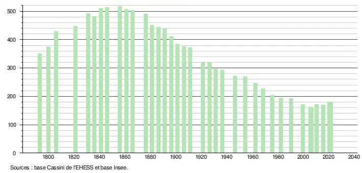 L'évolution du nombre d'habitants est connue à travers les recensements de la population effectués dans la commune depuis 1793. Pour les communes de moins de 10 000 habitants, une enquête de recensement portant sur toute la population est réalisée tous les cinq ans, les populations légales des années intermédiaires étant quant à elles estimées par interpolation ou extrapolation[28]. Pour la commune, le premier recensement exhaustif entrant dans le cadre du nouveau dispositif a été réalisé en 2005[29].
