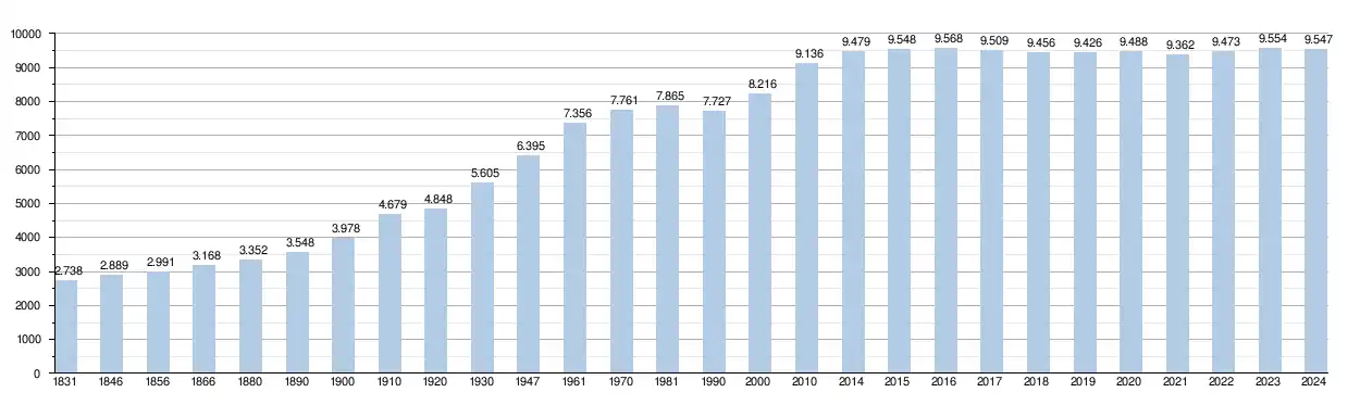 Elle comptait, au début 2024, 9 559 habitants (4 774 hommes et 4 785 femmes), soit une densité de 261,17 habitants/km²[4] pour une superficie de 36,60 km².