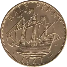 Demi-penny prédécimal de 1967 représentant le Golden Hind