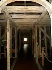 Cet ensemble supporte un étage mansardé divisé en deux dans le sens de la longueur par un large couloir. La partie inférieure de la toiture (brisis) est recouverte d'ardoises, la partie supérieure (terrasson) est couverte en tuiles[5]. Deux lucarnes, aux extrémités du couloir, éclairent le comble dont les dégagements latéraux servaient à stocker les étoffes[1].