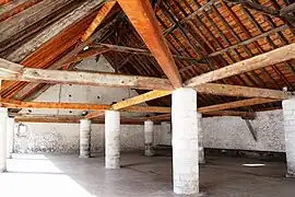 La halle est couverte d'un toit en ardoise. Elle est complètement fermée sur 2 côtés, nord et ouest. La charpente en bois, construite par des cagots, est soutenue par 13 colonnes rondes en pierre et 2 murs pleins.