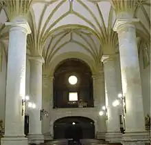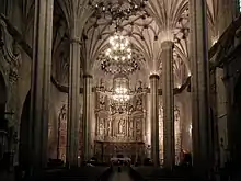 Elle se caractérise aussi par des colonnes très élancées qui supportent directement les voûtes juxtaposées, et dont on a pu dire que, loin de diviser l'espace, elles l'élargissent ; il en résulte une certaine minceur des profils, une rigidité contrastant avec la complication des nervures des voûtes.