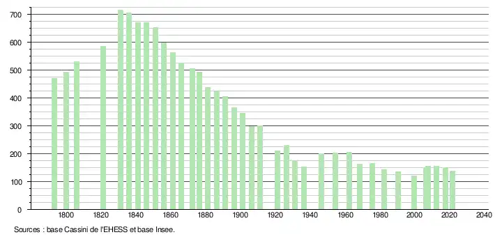 L'évolution du nombre d'habitants est connue à travers les recensements de la population effectués dans la commune depuis 1793. Pour les communes de moins de 10 000 habitants, une enquête de recensement portant sur toute la population est réalisée tous les cinq ans, les populations légales des années intermédiaires étant quant à elles estimées par interpolation ou extrapolation[17]. Pour la commune, le premier recensement exhaustif entrant dans le cadre du nouveau dispositif a été réalisé en 2007[18].