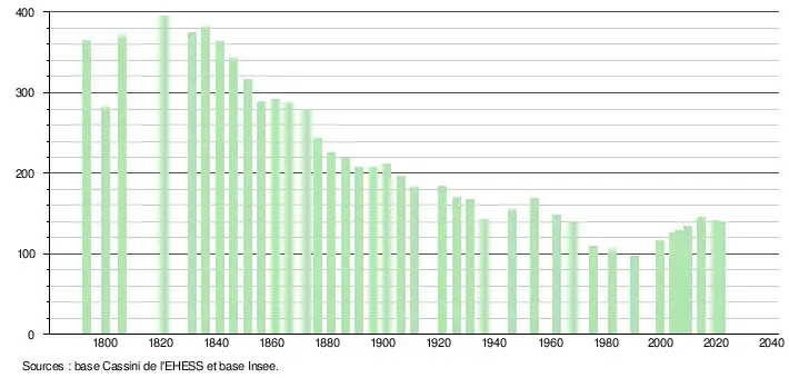 L'évolution du nombre d'habitants est connue à travers les recensements de la population effectués dans la commune depuis 1793. Pour les communes de moins de 10 000 habitants, une enquête de recensement portant sur toute la population est réalisée tous les cinq ans, les populations légales des années intermédiaires étant quant à elles estimées par interpolation ou extrapolation[28]. Pour la commune, le premier recensement exhaustif entrant dans le cadre du nouveau dispositif a été réalisé en 2004[29].