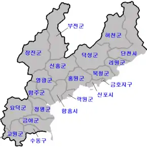 - Hongwŏn-gun (홍원군; 洪原郡), 142 910 hab.
