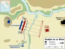 Avant que la nouvelle de la défaite du Tessin n'atteigne Rome, le Sénat romain ordonne au consul Tiberius Sempronius Longus de ramener son armée de Sicile pour se joindre à Scipio et affronter Hannibal[57]. Ce dernier, par d'habiles manœuvres, est en position de le contrer puisqu'il contrôle la route reliant Plaisance à Arminum que Sempronius doit emprunter pour renforcer Scipio. Il prend ensuite Clastidium — actuelle Casteggio en Lombardie — où il trouve de quoi approvisionner ses hommes. Mais ce succès n'est pas complet car Sempronius, profitant du manque de vigilance d'Hannibal, se glisse sur son flanc et rejoint le camp de Scipio à côté de la rivière Trébie près de Plaisance[58]. En décembre 218 av. J.-C., Hannibal a l'occasion de démontrer une nouvelle fois ses capacités militaires supérieures durant la bataille de la Trébie[24]. Après avoir épuisé la résistance de l'infanterie romaine, il la taille en pièces par une attaque surprise qui débute par une embuscade sur les flancs[22],[59].