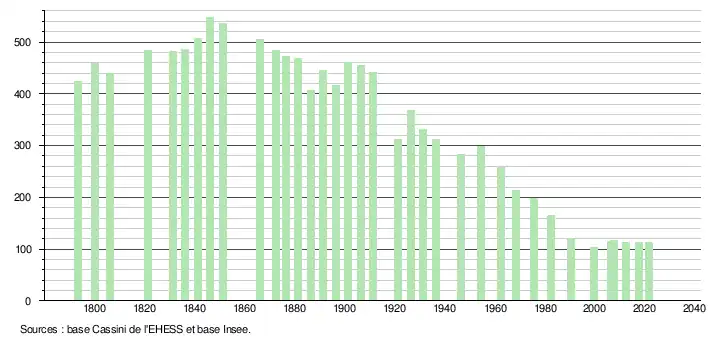 L'évolution du nombre d'habitants est connue à travers les recensements de la population effectués dans la commune depuis 1793. Pour les communes de moins de 10 000 habitants, une enquête de recensement portant sur toute la population est réalisée tous les cinq ans, les populations légales des années intermédiaires étant quant à elles estimées par interpolation ou extrapolation[17]. Pour la commune, le premier recensement exhaustif entrant dans le cadre du nouveau dispositif a été réalisé en 2007[18].