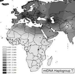 La part de la population appartenant à l'haplogroupe T1 dépasse 8 % en Roumanie, dans la vallée du Nil et au Kurdistan.