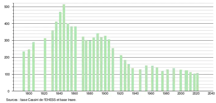 L'évolution du nombre d'habitants est connue à travers les recensements de la population effectués dans la commune depuis 1793. Pour les communes de moins de 10 000 habitants, une enquête de recensement portant sur toute la population est réalisée tous les cinq ans, les populations légales des années intermédiaires étant quant à elles estimées par interpolation ou extrapolation[17]. Pour la commune, le premier recensement exhaustif entrant dans le cadre du nouveau dispositif a été réalisé en 2007[18].