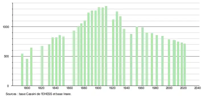 L'évolution du nombre d'habitants est connue à travers les recensements de la population effectués dans la commune depuis 1793. Pour les communes de moins de 10 000 habitants, une enquête de recensement portant sur toute la population est réalisée tous les cinq ans, les populations légales des années intermédiaires étant quant à elles estimées par interpolation ou extrapolation[22]. Pour la commune, le premier recensement exhaustif entrant dans le cadre du nouveau dispositif a été réalisé en 2007[23].