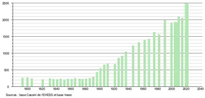 L'évolution du nombre d'habitants est connue à travers les recensements de la population effectués dans la commune depuis 1793. Pour les communes de moins de 10 000 habitants, une enquête de recensement portant sur toute la population est réalisée tous les cinq ans, les populations légales des années intermédiaires étant quant à elles estimées par interpolation ou extrapolation[28]. Pour la commune, le premier recensement exhaustif entrant dans le cadre du nouveau dispositif a été réalisé en 2004[29].