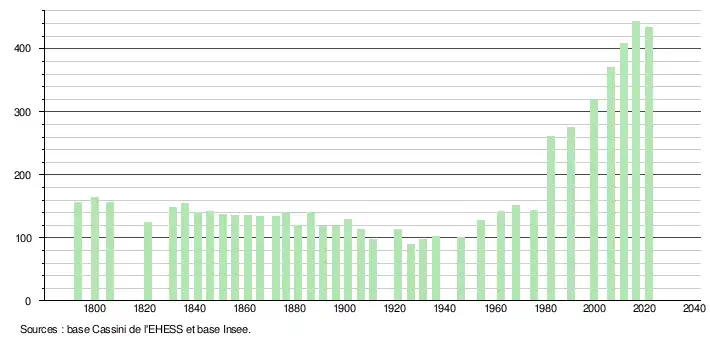 L'évolution du nombre d'habitants est connue à travers les recensements de la population effectués dans la commune depuis 1793. Pour les communes de moins de 10 000 habitants, une enquête de recensement portant sur toute la population est réalisée tous les cinq ans, les populations légales des années intermédiaires étant quant à elles estimées par interpolation ou extrapolation[21]. Pour la commune, le premier recensement exhaustif entrant dans le cadre du nouveau dispositif a été réalisé en 2006[22].