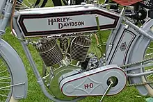En 1910, la Harley-Davidson Motor Company utilise pour la première fois le fameux logo dit « Bar & Shield »[n 6], qui devient une marque déposée en 1911[22]. Le monocylindre de 492 cm3 produit désormais 4,34 ch sous la dénomination « Model 6 ». La moto produite alors pèse moins de 100 kg.