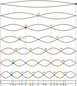 - L'échelle mélodique en usage, l'accord pythagoricien, est produit par la « génération des quintes » sur un monocorde. Pythagore ayant remarqué que la hauteur du son est inversement proportionnelle à la longueur de la corde, avait défini les rapports harmoniques comme des rapports de longueur — ou des rapports de fréquence. Par exemple, l'octave correspond au rapport 2/1, la quinte au rapport 3/2, la quarte au rapport 4/3, et ainsi de suite. Ces trois intervalles étaient par ailleurs considérés comme les principales consonances du système musical — cette conception sera maintenue jusqu'à la fin du Moyen Âge.