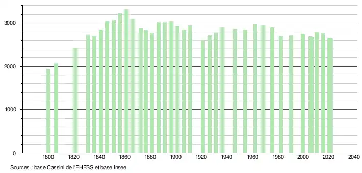 L'évolution du nombre d'habitants est connue à travers les recensements de la population effectués dans la commune depuis 1800. Pour les communes de moins de 10 000 habitants, une enquête de recensement portant sur toute la population est réalisée tous les cinq ans, les populations légales des années intermédiaires étant quant à elles estimées par interpolation ou extrapolation[26]. Pour la commune, le premier recensement exhaustif entrant dans le cadre du nouveau dispositif a été réalisé en 2005[27].