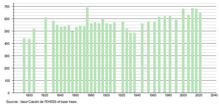 L'évolution du nombre d'habitants est connue à travers les recensements de la population effectués dans la commune depuis 1793. Pour les communes de moins de 10 000 habitants, une enquête de recensement portant sur toute la population est réalisée tous les cinq ans, les populations légales des années intermédiaires étant quant à elles estimées par interpolation ou extrapolation[18]. Pour la commune, le premier recensement exhaustif entrant dans le cadre du nouveau dispositif a été réalisé en 2006[19].