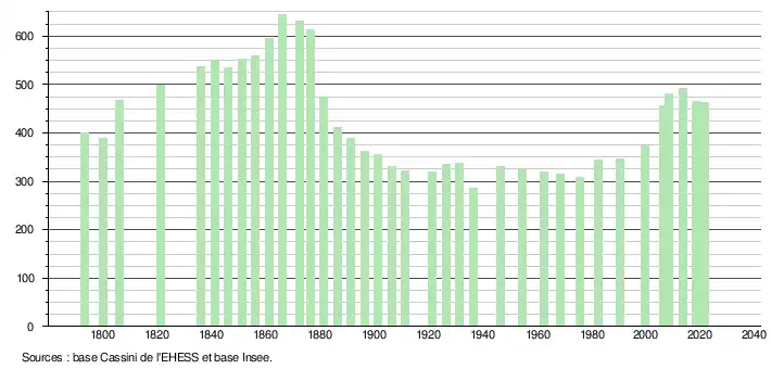 L'évolution du nombre d'habitants est connue à travers les recensements de la population effectués dans la commune depuis 1793. Pour les communes de moins de 10 000 habitants, une enquête de recensement portant sur toute la population est réalisée tous les cinq ans, les populations légales des années intermédiaires étant quant à elles estimées par interpolation ou extrapolation[20]. Pour la commune, le premier recensement exhaustif entrant dans le cadre du nouveau dispositif a été réalisé en 2008[21].