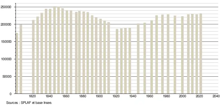 (Sources : SPLAF - population totale du département depuis sa création jusqu'en 1962[16] − puis base Insee − population sans doubles comptes de 1968 à 2006[17] puis population municipale à partir de 2006[18].)