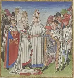Enluminure de 1460 représentant le mariage (vers 996) de Geoffroi avec Havoise de Normandie.