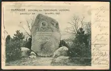 - Le monument de Rosenberg (de) avec un médaillon de portrait de von Rosenberg sur un bloc de granit est solennellement dévoilé le 20 avril 1902[7], tout d'abord dans le Jardin des Guelfes (de), dans l'actuelle Wilhelm-Busch-Straße[3], près des écuries du château des Guelfes (de)[8] Parmi les invités figurent, outre "sa majesté" l'empereur Guillaume II, le directeur de la ville Heinrich Tramm (de)[9].