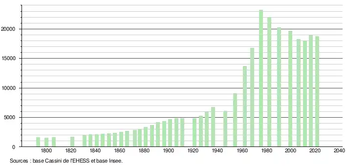 - Par convention dans Wikipédia, le principe a été retenu de n’afficher dans le tableau des recensements et le graphique, pour les populations légales postérieures à 1999, que les populations correspondant à une enquête exhaustive de recensement pour les communes de moins de 10 000 habitants, et que les populations des années 2006, 2011, 2016, etc. pour les communes de plus de 10 000 habitants, ainsi que la dernière population légale publiée par l’Insee pour l'ensemble des communes.