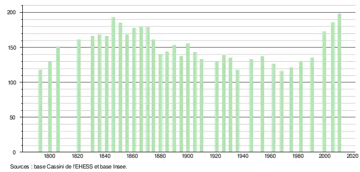 L'évolution du nombre d'habitants est connue à travers les recensements de la population effectués dans la commune depuis 1793. À partir du , les populations légales des communes sont publiées annuellement dans le cadre d'un recensement qui repose désormais sur une collecte d'information annuelle, concernant successivement tous les territoires communaux au cours d'une période de cinq ans. Pour les communes de moins de 10 000 habitants, une enquête de recensement portant sur toute la population est réalisée tous les cinq ans, les populations légales des années intermédiaires étant quant à elles estimées par interpolation ou extrapolation[2]. Pour la commune, le premier recensement exhaustif entrant dans le cadre du nouveau dispositif a été réalisé en 2005[3],[Note 1].