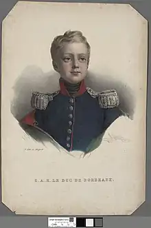 Henri d’Artois, duc de Bordeaux, plus connu sous son titre de courtoisie de comte de Chambord, né le au palais des Tuileries à Paris, et mort le au château de Frohsdorf à Lanzenkirchen en Autriche, est un prince de la famille royale de France, chef de la maison capétienne de Bourbon. Petit-fils du roi Charles X, chef et dernier représentant de la branche aînée et française de la maison de Bourbon, il est prétendant à la Couronne de France de 1844 à sa mort sous le nom d'Henri V.