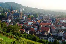 La ville elle-même avec son Starkenburg médiéval, bâti en 1065, se trouve au pied de la Montagne du Château (Schlossberg).