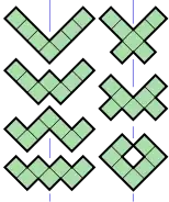 - 7 heptaminos (de couleur verte)possèdent un axe de symétrie à 45 degrés par rapport au quadrillage. Leur groupe de symétrie comporte deux éléments : l'identité (aucun changement) et une symétrie dont l'axe passe par la diagonale d'un carré.