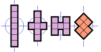 - 1 heptamino (de couleur orange) possède deux axes de symétrie de réflexion, tous deux alignés avec les diagonales. Son groupe de symétrie comporte également quatre éléments. Son groupe de symétrie est aussi le groupe dièdre d'ordre 2 à quatre éléments.